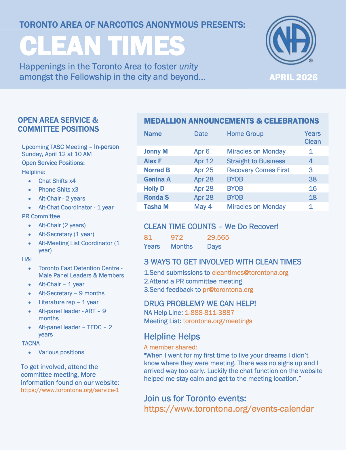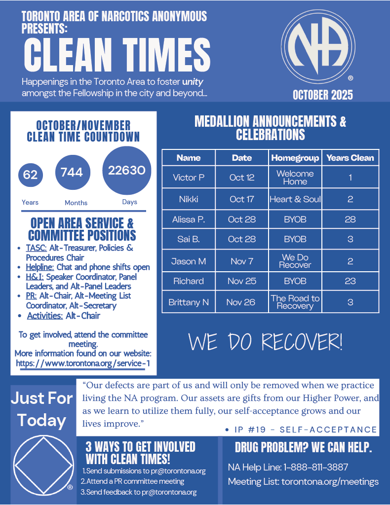 Clean Times is the newsletter distributed by the Toronto Area of Narcotics Anonymous and is published monthly.